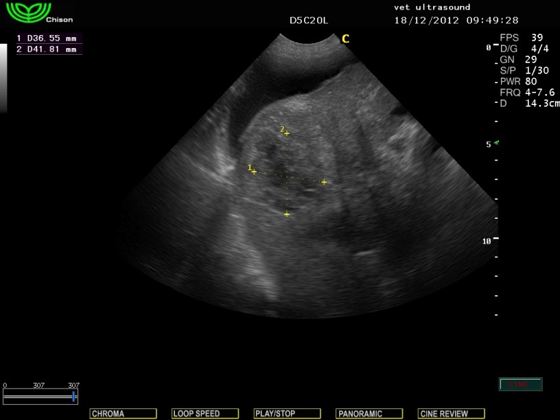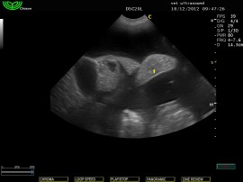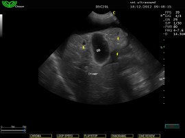 Υποηχογενείς αλλοιώσεις στους αριστερούς και διαφραγματικούς λοβούς του ήπατος και άφθονη παρουσία υγρού στη περιτοναική κοιλότητα.