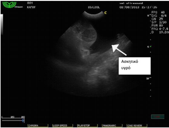 κοιλίας καθώς και παρουσία ασκητικού υγρού. Το ήπαρ φαινόταν