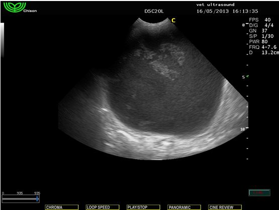 Προσκομίστηκε με έντονο πόνο στην κοιλιακή κοιλότητα και αυξημένα λευκά αιμοσφαίρια. Τις προηγούμενες ημέρες είχε ιστορικό από έντονες διάρροιες και οι ιδιοκτήτες φοβόντουσαν για το ενδεχόμενο ξένου σώματος.