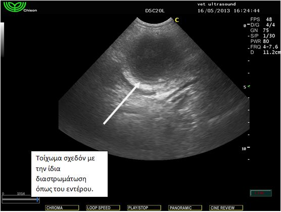Ευρήματα: Στον υπέρηχο εντοπίστηκε μικρή παρουσία ασκητικού υγρού και μία μάζα στρογγυλή σαφώς περιγεγραμμένη χωρίς να δείχνει να έχει πρόσφυση σε κάποιο όργανο. Το τοίχωμά της φαινόταν αρκετά παχύ και στο εσωτερικό υπήρχε παρουσία παχύρρευστου υγρού. Στη διαφορική διάγνωση υπήρχε η υποψία για κάποιο απόστημα της περιτοναικής κοιλότητας, κύστη του μεσεντερίου και η δίλοβος εντερική κύστη (intestinal duplicated cyst). Μετά από χειρουργική εξαίρεση βρέθηκε πως η κύστη αυτή ήταν κολλημένη πάνω στο παχύ έντερο από την μία πλευρά και από το μεσεντέριο από την άλλη. Το περιεχόμενο ήταν μία άμορφη ουσία παχύρρευστη. Το τοίχωμα της κύστης έμοιαζε με το τοίχωμα του εντέρου. Η διάγνωση τέθηκε τελικά ως δίλοβος εντερική κύστη.