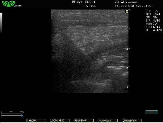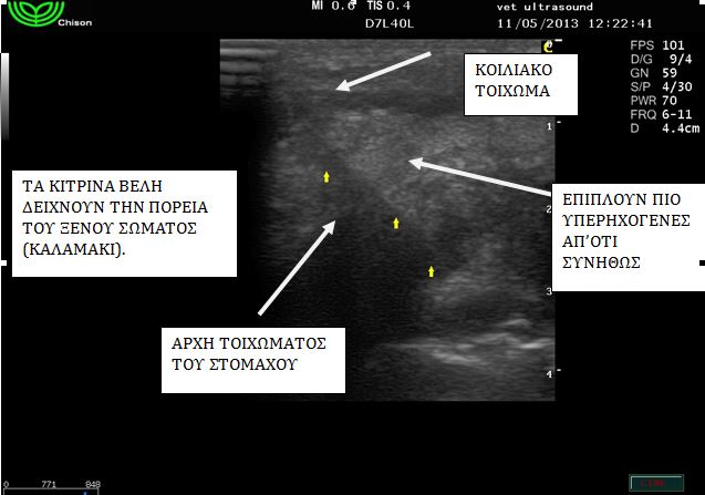 Στην υπερηχοτομογραφική εξέταση βρέθηκε ξένο σώμα το οποίο ξεκινούσε από το στομάχο και πρόβαλε κάτω από το δέρμα.