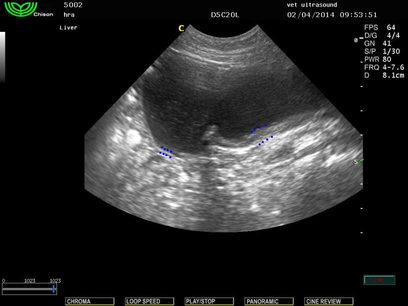 Στον υπερηχοτομογραφικό έλεγχο βρέθηκε εκκόλπωμα της ουροδόχου κύστης. Απώλεια του φυσιολογικού πάχους του τοιχώματος στο τμήμα του θόλου της ουροδόχου κύστης. Έγινε κυστεοκέντηση όπου και βρέθηκε αφθονία μικροβίων και φλεγμονικών κυττάρων. Μετά από ούρηση του ασθενή βρέθηκε πως το τμήμα που διέθεται φυσιολογικό πάχος, είχε αδειάσει ενώ το εκκόλπωμα είχε παραμείνει ίδιο σε μέγεθος. Κλινικά ο ασθενής δεν εκδήλωνε σημάδια ουρολοίμωξης. Λόγω του οτι δεν υπήρχαν συμπτώματα ο ιδιοκτήτης δεν θέλησε να προχωρήσει σε επιδιόρθωση του προβλήματος.