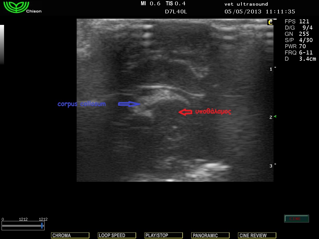 Εγκάρσια τομή με φορά της δέσμης του υπερήχου προς το ινιακό τρήμα.