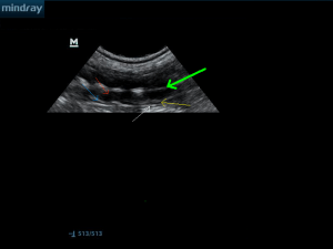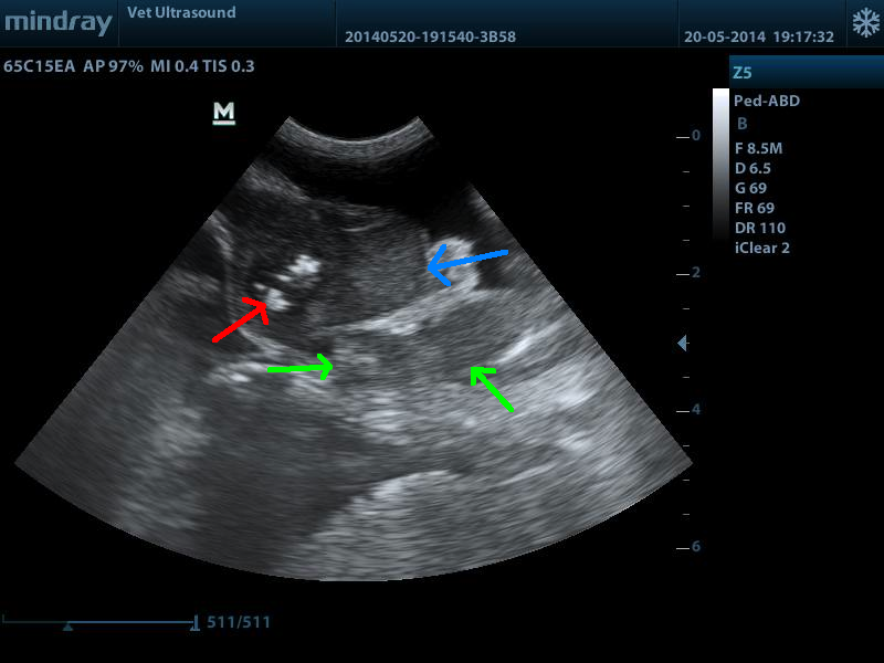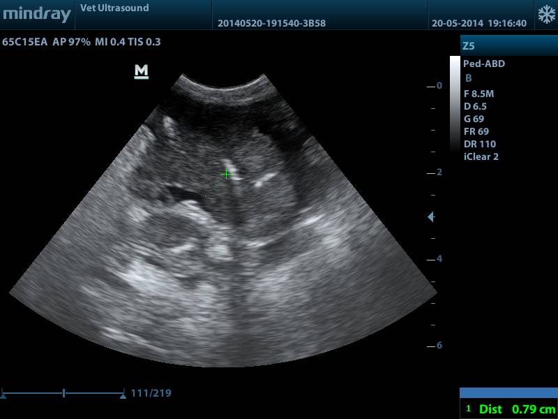 Ζητήθηκε υπέρηχος λόγω έντονης διόγκωσης της κοιλίας, κατάπτωσης , μείωσης του αιματοκρίτη και αύξησης των λευκών αιμοσφαιρίων ιδιαίτερα των λεμφοκυττάρων.