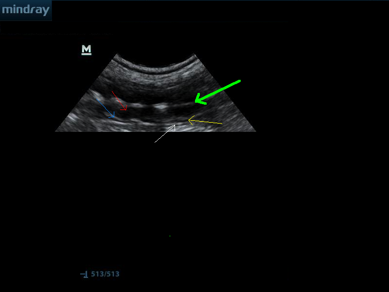φυσιολογική διαστρωμάτωση λεπτού εντέρου, πράσινο βέλος αυλός του εντέρου( άσπρος λόγω ανάμειξης υγρού και αέρα), κόκκινο βέλος βλεννογόνος ( μαύρο), μπλέ βέλος υποβλεννογόνιος(άσπρο), κίτρινο βέλος μυικός χιτώνας (μαύρο), άσπρο βέλος ορογόνος (άσπρο)