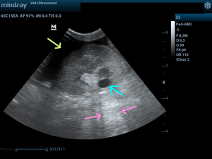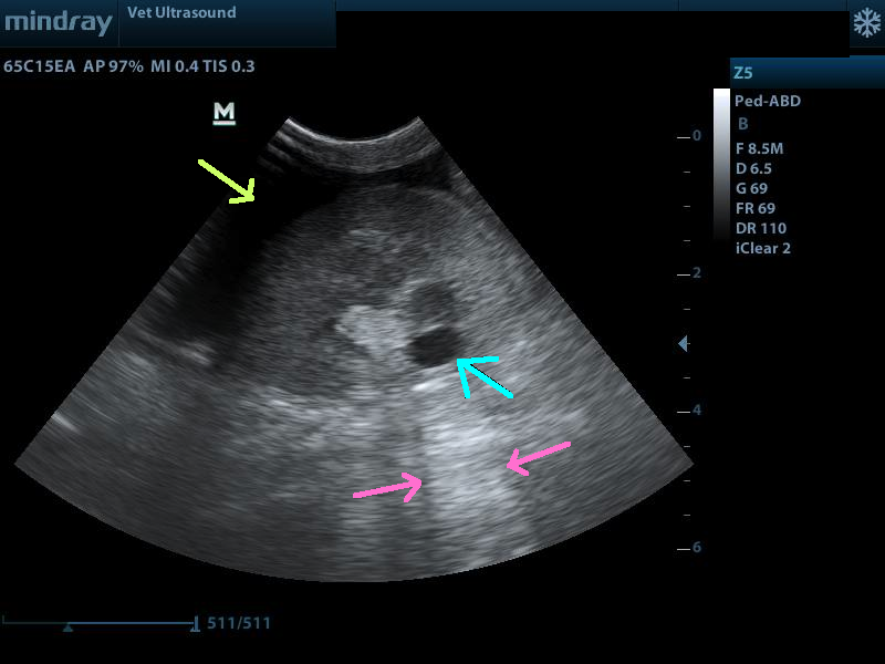 κίτρινο βέλος ελέυθερο υγρό στη περιτοναική κοιλότητα, μπλέ βέλος κύστη του νεφρικού παρεχγχύματος, ροζ βέλη ακουστική ενίσχυση ( επιβεβαίωση πως πρόκειται για κύστη και όχι για κάποια υποηχογενή μάζα).