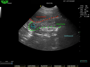 Ιστορικό: Προσκομίσθηκε σε κλινική επειδή εμφάνισε αίμα από την περιοχή του αιδοίου και διόγκωση του οργάνου. Η ιδιοκτήτρια το είχε παρατηρήσει και παλαιότερα, με συχνότητα εμφάνισης μία φορά το χρόνο περίπου. Ζητήθηκε υπερηχογράφημα κοιλίας για να ελεγχθεί η ουροδόχος αλλά και το κολόβωμα της μήτρας.