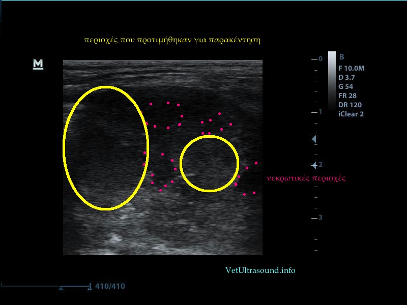 Στον υπέρηχο εμφανίζονταν αρκετές περιοχές υποηχογενείς, πιθανόν νεκρωτικές, ενώ αντίθετα στην περιφέρεια της μάζας η εικόνα του ιστού φαινόταν αρκετά πιο συμπαγής. Για να έχουμε καλό κυτταρολογικό υλικό προτιμήσαμε την περιφέρεια της αλλοίωσης ώστε να μην πάρουμε φλεγμονικά κύτταρα και κυτταρικά ράκη από τις νεκρωτικές περιοχές. Η αιμάτωση της μάζας ήταν μειωμένη, έτσι ο κίνδυνος τρώσης κάποιου αγγείου ήταν μειωμένος. Σε περίπτωση που η αλλοίωση βρίσκεται πιο βαθειά ή έχει έντονη αιμάτωση, η μέθοδος εκλογής για βιοψία ή FNA είναι η αξονική τομογραφία.