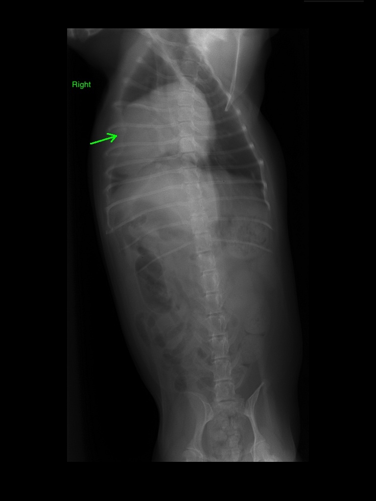 Διάγνωση: Έγινε ακτινογραφία θώρακος όπου και βρέθηκε πλήρης πύκνωση του δεξιού μέσου λοβού του θώρακα και εισολκή της κάψας του υπεζωκότα. Επειδή η αλλοίωση ακουμπούσε στο θωρακικό τοίχωμα κρίθηκε σκόπιμο να γίνει αναρρόφηση υλικού με την βοήθεια υπερήχου για κυτταρολογική εξέταση. Το αποτέλεσμα ήταν υπέρ νεοπλασματικής εξεργασίας (βρογχοκυψελιδικό καρκίνωμα). Υπήρχε μια μικρή υποψία λόγω της θέσης της αλλοίωσης πως θα μπορούσε να έχει δημιουργηθεί νέκρωση και φλεγμονή του δεξιού μέσου λοβού καθώς συνήθως είναι το μέρος που τα περισσότερα ξένα σώματα καταλίγουν εξαιτίας της λοξής πορείας προς τα πίσω του δεξιού στελεχιαίου βρόγχου, ενώ αντίθετα ο αριστερός είναι πιο κάθετος στην τραχεία. Η κυτταρολογική εξέταση απέκλεισε αυτή την περίπτωση σε συνδυασμό με την κλινική εικόνα του ασθενή.