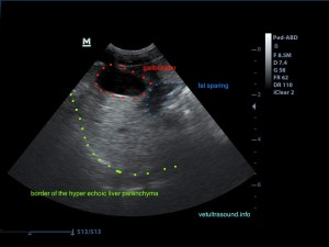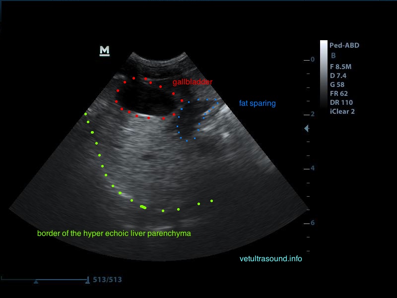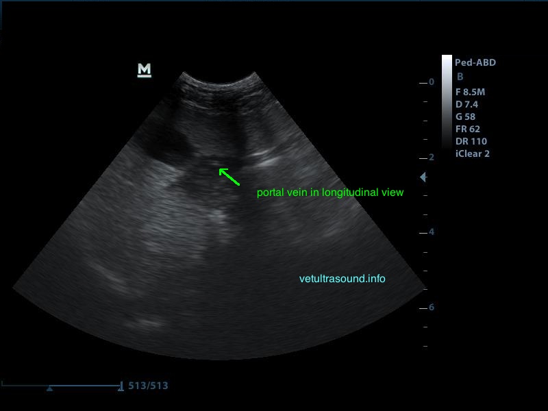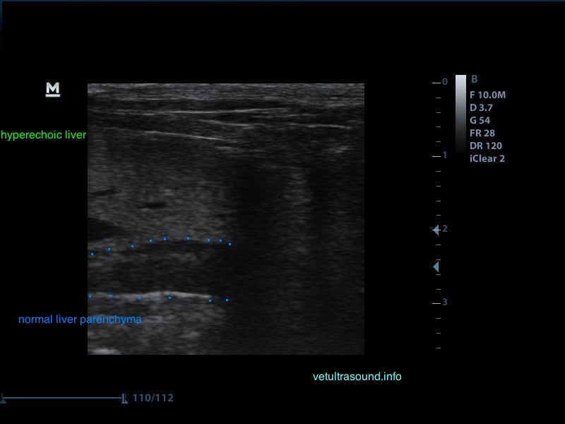 Το ήπαρ εμφανίζεται υπερηχογενές και ο ήχος εξαντλείται καθώς περνάει μέσα από αυτό. Δεν είναι εύκολη η διαφοροποίηση του τοιχώματος της πυλαίας φλέβας σε σχέση με το υπόλοιπο παρέγχυμα.