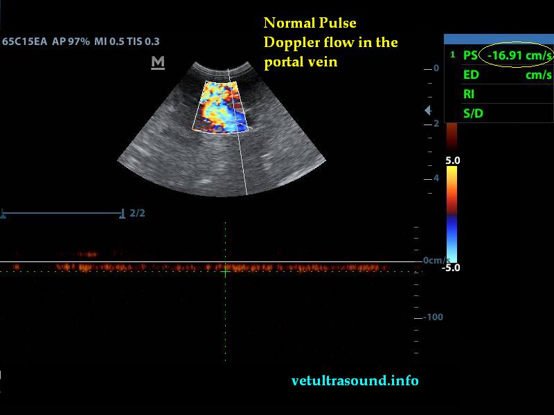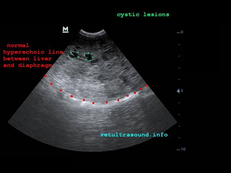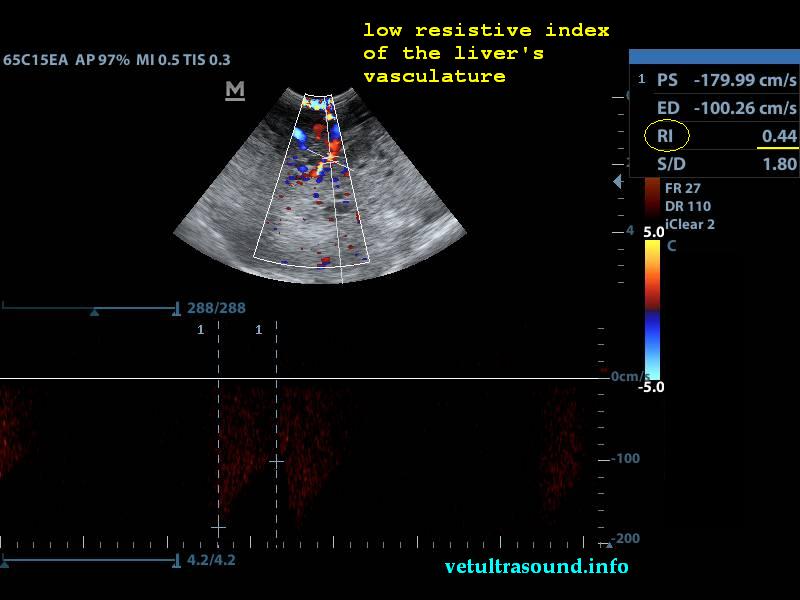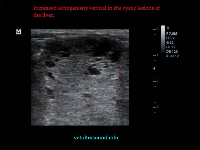 Στον υπέρηχο βρέθηκε ανομοιογένεια του ηπατικού παρεγχύματος, πολυάριθμοι κυστικοί σχηματισμοί οι οποίοι καταλάμβαναν κυρίως τον δεξιό πλάγιο λοβό του οργάνου(pic1&2). Η ροή του αίματος στη πυλαία φλέβα με τη βοήθεια του Pulse Wave Doppler βρέθηκε φυσιολογική(pic3), ενώ σε κλάδο της δεξιάς ηπατικής αρτηρίας ο δείκτης αγγειακής αντίστασης βρέθηκε μειωμένος(normal RI≈ 0.55)(pic4). Στοιχείο που μας δείχνει πως είτε η αγγείωση στη συγκεκριμένη περιοχή είναι νεόπλαστη, είτε λόγω χρόνιας νόσου ο διάμεσος ιστός που περιβάλλει τα αγγεία έχει χάσει την σκληρότητά του. Μικρή ποσότητα ασκιτικού υγρού βρέθηκε ανάμεσα στις εντερικές έλικες. Χωρίς παθολογικά διογκωμένους λεμφαδένες εκτιμήθηκε η κοιλιακή κοιλότητα(pic5). Οι υπόλοιπες δομές ελέγχθηκαν χωρίς παθολογικά ευρήματα.