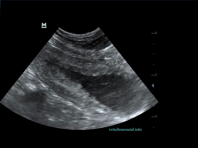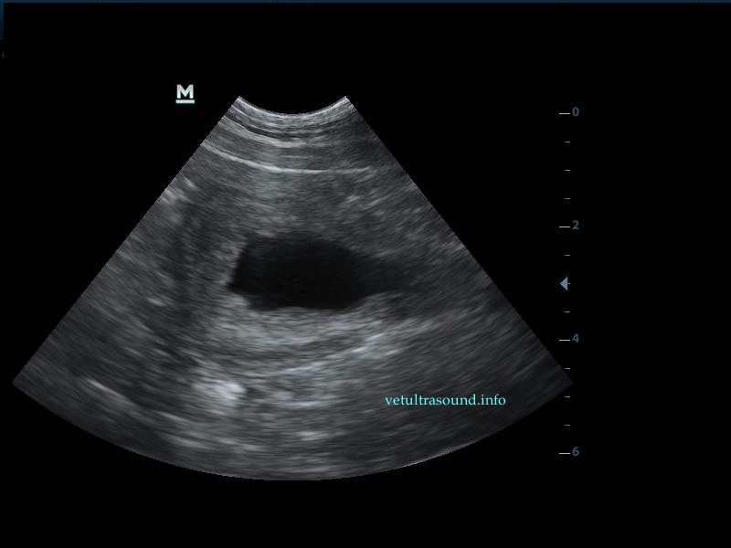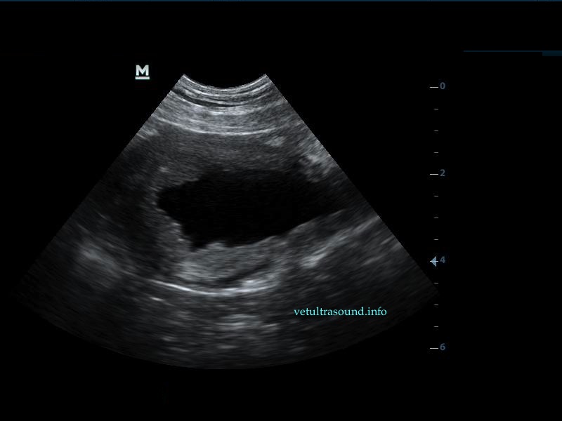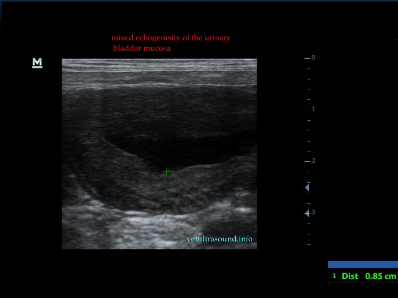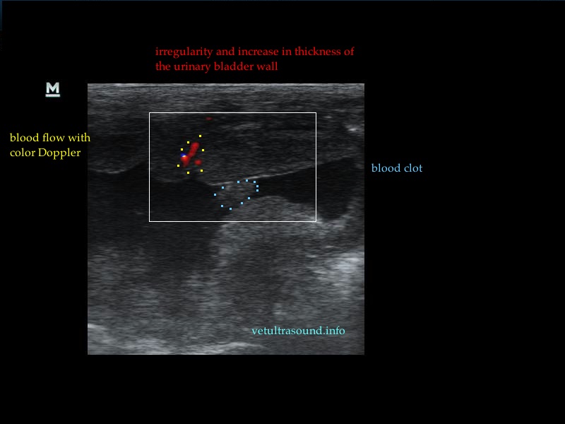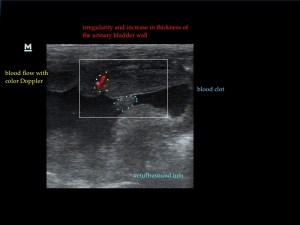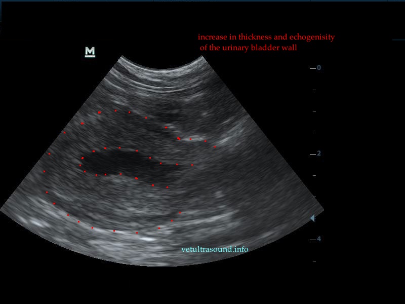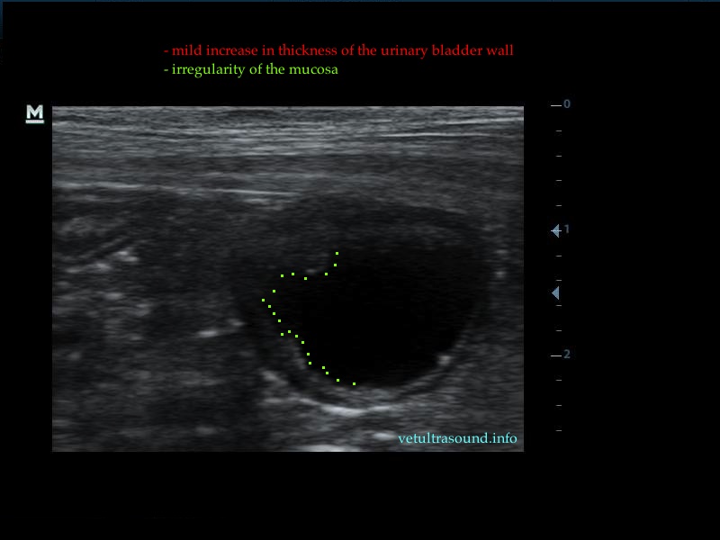 The increase of thickness of the urinary bladder wall and the striation of the mucosa is evident. Inguinal lymphnodes are usually prominent and mildly enlarged. Colour Doppler may reveal the blood flow of the mucosa of the empty urinary bladder, whereas the blood flow in a full bladder appears decreased. This could be because of the fibrosis of the urinary bladder wall and could explain why sometimes chronic conditions like these do not respond well to antibiotics. This pathophysiology has been studied in humans with the use of endoscopic ultrasound.