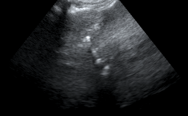 Ευρήματα: Διόγκωση του ήπατος και απώλεια της φυσιολογικής δομής του οργάνου. Η εικόνα ήταν συμβατή με νεοπλασματική εξεργασία του ήπατος. Ο ιδιοκτήτης δεν θέλησε να προχωρήσουμε σε περαιτέρω διαγνωστκές εξετάσεις.Κατά τον έλεγχο της πυλαίας φλέβας βρέθηκε αέρας στο εσωτερικό της. Ο αέρας προερχόταν από τον βλεννογόνο του εντέρου καθώς απεικονιζόταν έντονα υπερηχογενής στοιχείο συμβατό με ίνωση, καταστροφή του βλεννογόνου ή αιμορραγική γαστρεντερίτιδα. Δεν είχαν αναφερθεί αιμοραγικές διάρροιες από τον ιδιοκτήτη. Η πρόγνωση του περιστατικού ήταν δυσμενής καθώς ο αέρας στην πυλαία φλέβα σημαίνει πως έχει καταστραφεί ο βλεννογόνιος φραγμός του εντέρου και συνεπώς η είσοδος μικροβίων στη συστηματική κυκλοφορία είναι η πιο συχνή επιπλοκή.