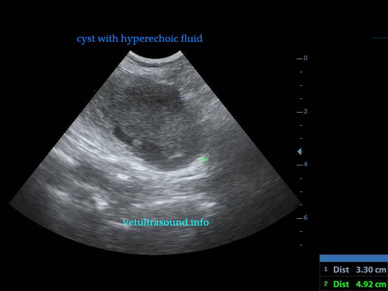 Ευρήματα: Στην υπερηχοτομογραφική εξέταση της κοιλίας βρέθηκε ήπια διόγκωση των μεσεντέριων λεμφαδένων με αντιδραστική ηχομορφολογία (pic3). Σε τμήμα του λεπτού εντέρου βρέθηκε κύστη με υπερηχογενές περιεχόμενο(pic2) η οποία εφαπτόταν στο τοίχωμά του (pic3)και μείωνε τον αυλό του. Υπήρχε διάταση των εντερικών ελίκων πριν από την κύστη αυτή. Δεν βρέθηκε ασκιτικό υγρό. Το μεσεντέριο λίπος περιφερικά αυτής ήταν υπερηχογενές.