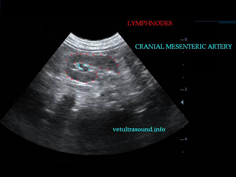 Findings: There was a mild enlargement of the mesenteric lymphnodes(pic3). In a small segment of the small intestine a cyst was noted which was attached to the intestinal wall(pic2.3). There were also dilated intestinal loops before the cyst due to the narrowed intestinal lumen. No free fluid was noted. There was a mild increase of the mesenteric fat arround the cyst.