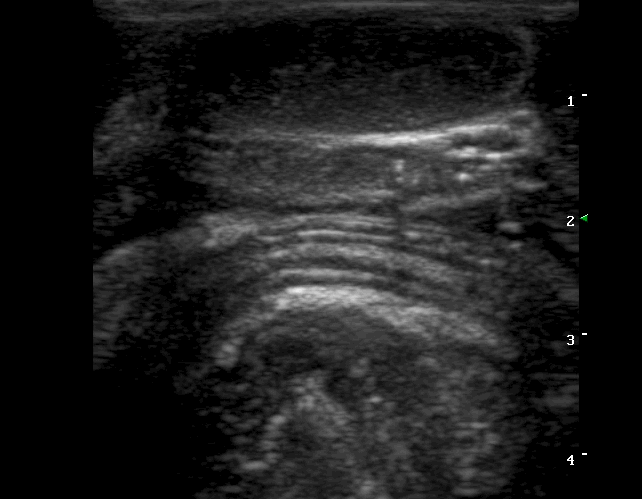 Ιστορικό: Διάρροιες εδώ και μία εβδομάδα. Αρνητικό σε ορολογική εξέταση για Parvovirus. Παρόλη την υποστηρικτική θεραπεία ο ασθενής συνέχιζε να καταπέφτει και μία ημέρα πριν τον υπέρηχο ξεκίνησε εμέτους.