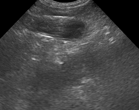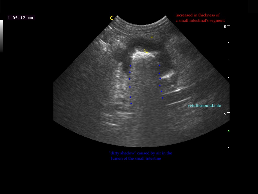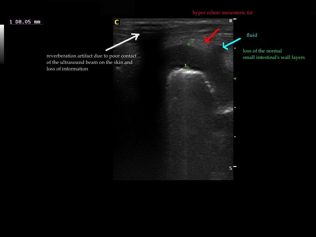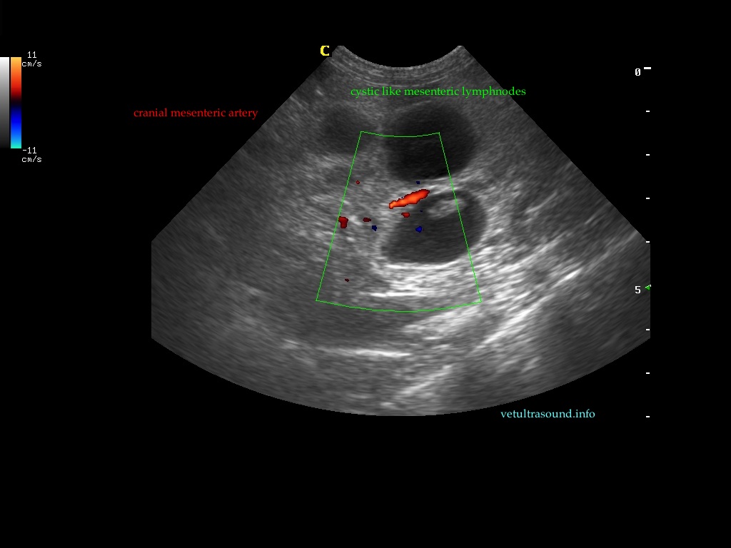 Findings: The ultrasound exam revealed a marked distention of a segment of the small intestine which ended in a narrowed lumen due to a thickened wall. The mesenteric lymph nodes were markendly enlarged and hypoechoic. A fine needle aspirate was performed.