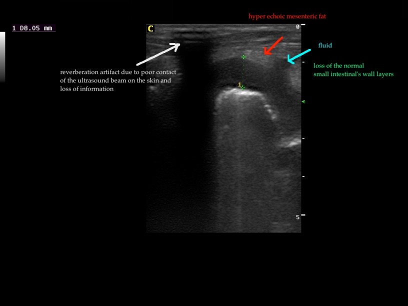 Ευρήματα: στην υπερηχοτομογραφική εξέταση βρέθηκε διάταση τμήματος εντερικής έλικας του λεπτού εντέρου, η οποία κατέληγε σε στένωση του αυλού εξαιτίας της διάχυτης πάχυνσης του τοιχώματος του λεπτού εντέρου. Οι μεσεντέριοι λεμφαδένες κοντά στην έκφυση της πρόσθιας μεσεντέριας αρτηρίας ελέγχθηκαν έντονα υπόηχοι και διογκωμένοι. Η λήψη κυτταρολογικού υλικού ήταν αναγκαία για τον χαρακτηρισμό των αλλοιώσεων, την εκτίμηση της θεραπείας και πρόγνωσης του περιστατικού.