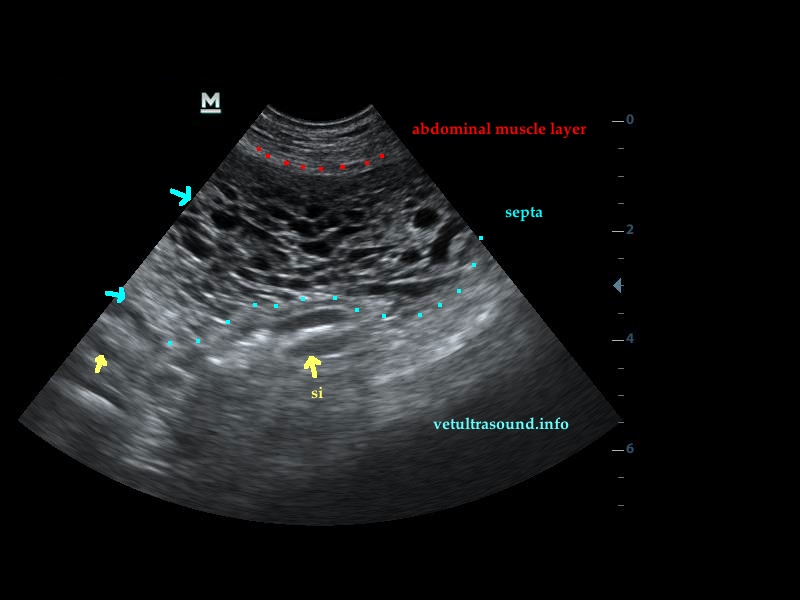 It is evident in dogs with Leishmania, history of surgery, septic peritonitis or chronic peritoneal foreign bodies.