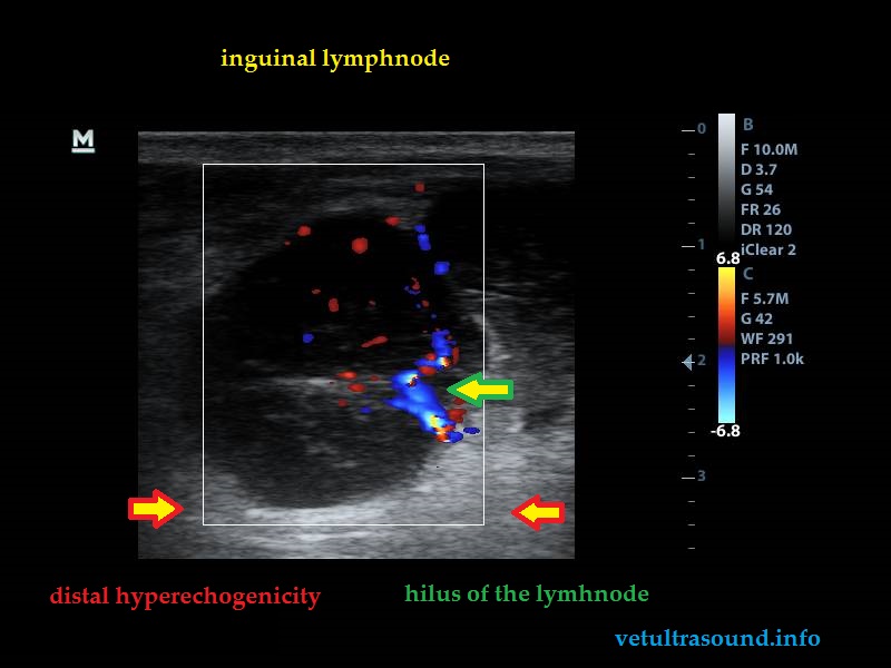 - Marked enlargement of the inguinal and iliac lymphnodes. The ratio of the short axis diameter / long axis diameter was 0.84. The inguinal lymphnodes appeared rounded and hypoechoic with distal sound enhancement. The iliac lymphnodes were isoechoic, rounded with increased central and peripheral blood flow(6).